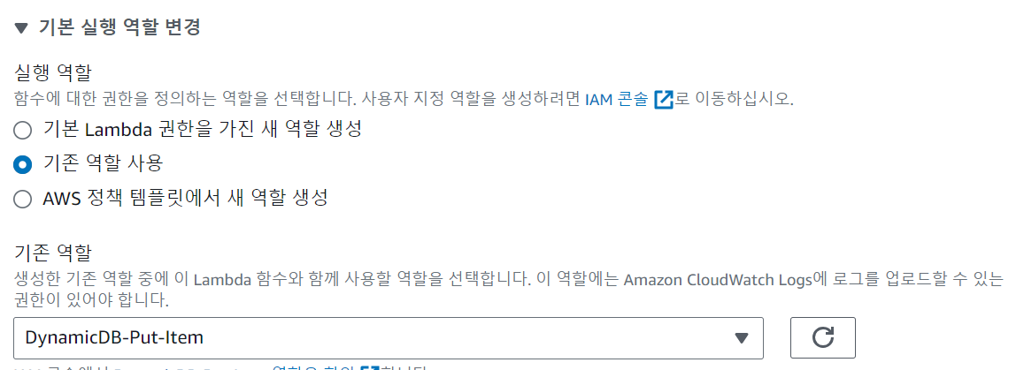 ✅ Lamda 선택 > AmazonDynamoDBFullAccess 정책 추가 > DynamicDB-Put-Item로 역할 이름 생성